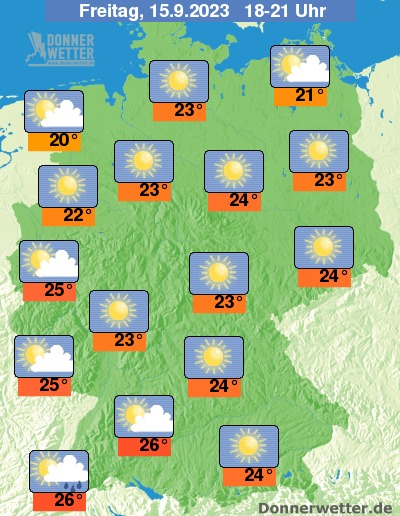 Heute Abend zeigt sich das Wetter verbreitet sonnig oder nur locker bewölkt. Im Südwesten sind örtlich auch dichte Quellwolken und seltene Schauer und Gewitter möglich. Sonst bleibt es trocken bei Temperaturen von 20 Grad in Bremerhaven und rund 26 Grad in Stuttgart.