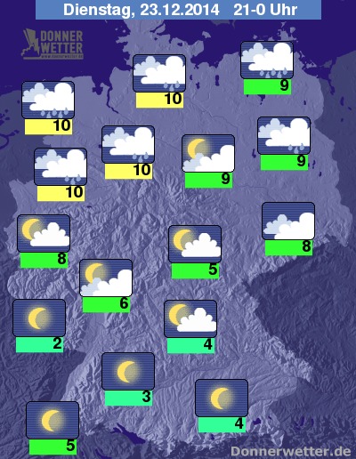 Heute Abend ziehen im Norden verbreitet dichte Wolken durch und es fällt zeitweise, zum Teil auch kräftiger Regen. In der breiten Mitte ist es ebenfalls meist stark, teils jedoch auch aufgelockert bewölkt, dabei bleibt es weitgehend trocken. Im Süden ist es dagegen meist nur locker bewölkt und häufig sogar sternenklar, dabei bleibt es auch trocken. Der Wind weht im Norden noch oft frisch bis stark, an den Küsten und in Böen auch stürmisch. Die Abendtemperatur liegt bei 10 Grad an der Nordsee und 2 Grad am Pfälzer Wald.