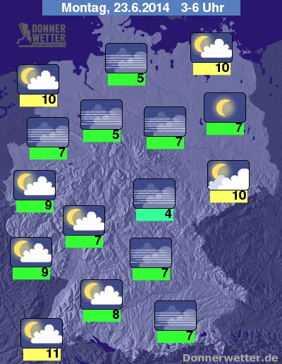 Heute Nacht bildet sich hier und da hochnebelartige Bewölkung, jedoch bleibt es dabei weitgehend trocken. Vielerorts ziehen auch nur lockere Wolkenfelder durch oder es bleibt bei einem klaren Himmel. Die Temperatur sinkt auf 11 Grad im Breisgau und etwa 4 Grad im Thüringer Wald.