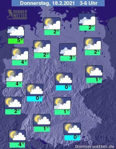 Am Donnerstag ist es zunächst teils stark, teils locker bis aufgelockert bewölkt, dabei bleibt es noch weitgehend trocken. Im Westen und Südwesten ziehen im Tagesverlauf jedoch dichte Wolken auf, die hier Regen mitbringen, im übrigen  Land bleibt es weiterhin meist trocken. Die Temperatur steigt auf 5 Grad auf Rügen und bis 12 Grad im Breisgau.