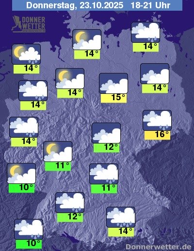 Heute Abend halten sich über der Bundesrepublik zum Großteil dichte Wolken, dazu fällt vor allem im Süden und Westen, aber auch z.B. über Sachsen verbreitet Regen. Auflockerungen zeigen sich am ehesten im Norden, hier bleibt es auch über weite Landesteile trocken. Die Temperatur liegt bei 10 Grad am Oberrhein und bis 16 Grad in der Niederlausitz.