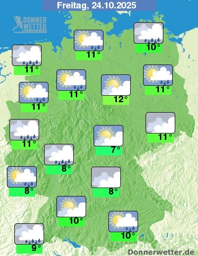 Am Freitag zieht oft starke Bewölkung durch, besonders am Nachmittag ist es aber auch vielerorts wechselnd oder aufgelockert bewölkt. Es können sich aber den ganzen Tag über gebietsweise Schauer bilden. Die Temperatur steigt auf 7 Grad in Jena und bis 12 Grad in Magdeburg. Vor allem über dem Norden weht der Wind oft stürmisch, sonst meist mäßig bis stark.