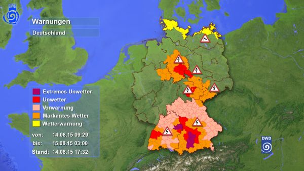 Aktuell gibt es in Bayern und Baden-Württemberg Unwetter durch schwere Gewitter mit zum Teil Hagel und Starkregen. Auch im Osten Niedersachsen und im Westen Sachsen-Anhalts gibt es noch Gewittertätigkeit mit Unwetter.