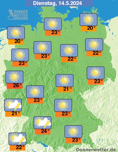Am Dienstag scheint die Sonne über weiten Landesteilen von einem meist wolkenlosen Himmel; zwischen Eifel und Schwarzwald kann sich im Tagesverlauf auch mal dichtere Quellbewölkung bilden, vor allem ab dem Mittag muss hier dann auch mit Schauern und teils kräftigen Gewittern gerechnet werden, lokal auch mit Starkregen einhergehend.