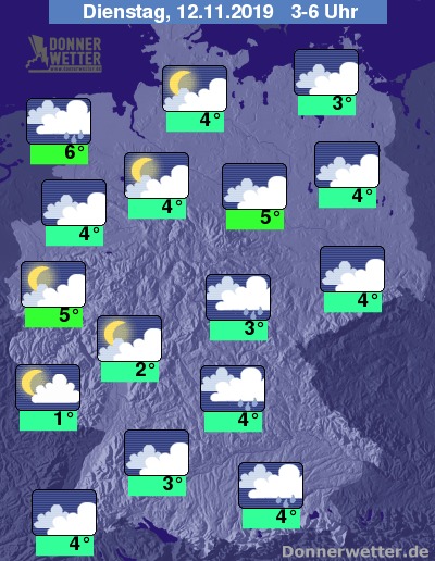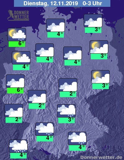 In der Nacht auf Dienstag ist der Himmel über weiten Teilen des Landes stark bewölkt oder bedeckt, einzelne Wolkenlücken gibt es in den nächsten Stunden vor allem im Westen und Nordwesten sowie an der Neiße. Häufig bleibt es trocken, einzelne Schauer sind in der Nacht meist nur im Umfeld der Nordseeküste sowie regional im Süden und Südosten zu erwarten. In den höheren Lagen des Schwarzwalds können auch Schneeregen- oder Schneeschauer fallen.