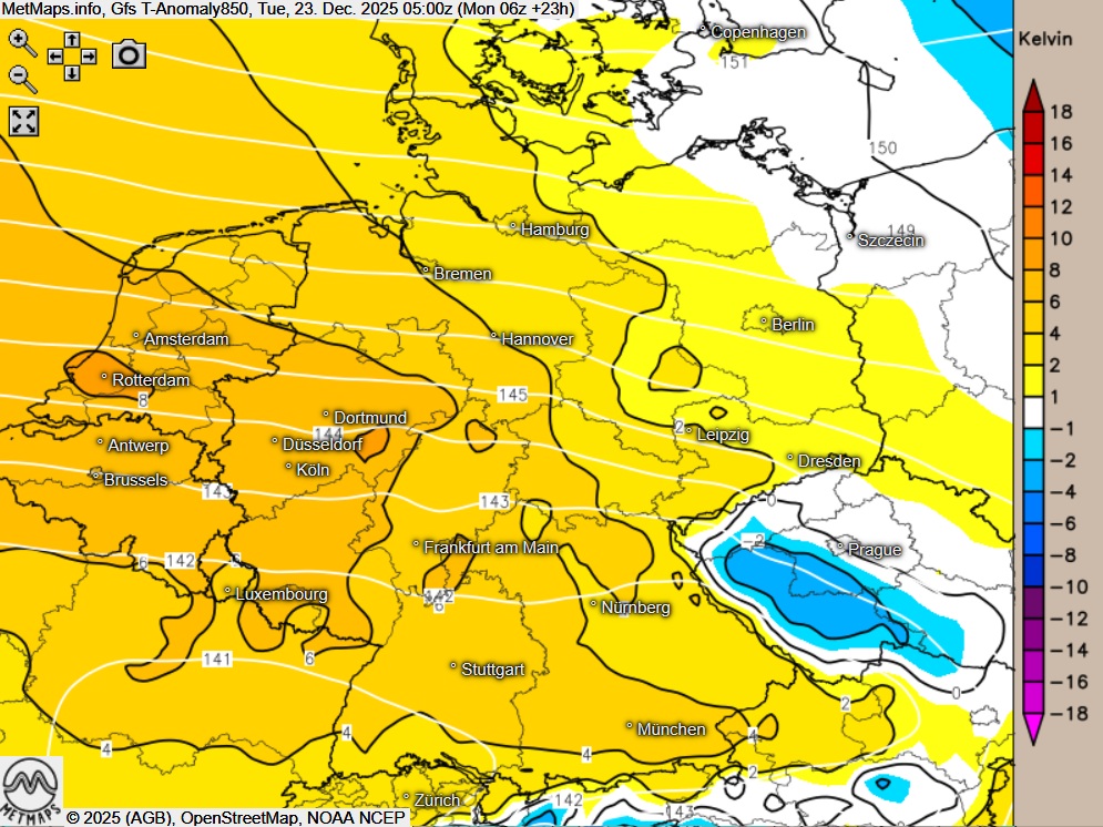 Die Lufttemperaturen und Temperaturabweichung in 1.500 m Höhe sowie die Wetterkarte für Dienstagfrüh (06:00 Uhr) nach GFS: