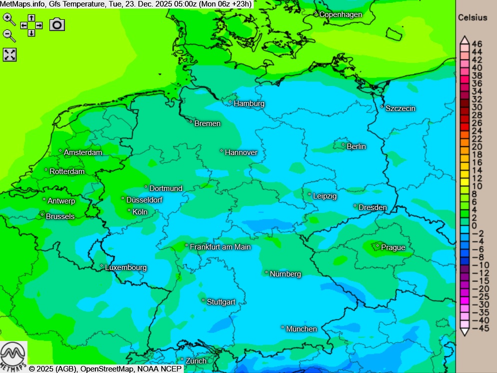 Die Temperaturen erreichen am Nachmittag Höchstwerte um 2 bis 6 Grad.