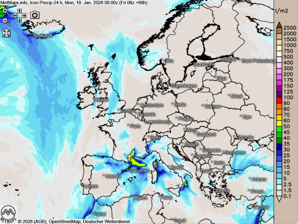 Die Temperaturen am Sonntagmorgen (06:00 Uhr), die Gesamtbewölkung am Nachmittag (15:00 Uhr) sowie die 24-Stunden-Regenmengen Europa am Sonntag nach ICON: