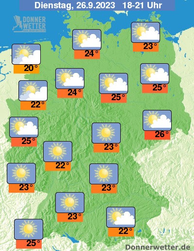 Heute Abend ist es weiterhin verbreitet sonnig oder nur locker bewölkt. Mehr Wolken sind in Nordseenähe und auch im übrigen Nordwesten Deutschlands möglich. Es bleibt landesweit trocken bei Werten von 20 Grad in Bremerhaven und 26 Grad in Dresden.