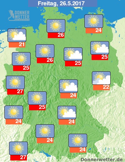 Fast im ganzen Land strahlt die Sonne von einem blauen Himmel und erwärmt die Luft nach Frühwerten von 8 bis 14 Grad bis zum späten Nachmittag auf frühsommerliche 22 bis 28 Grad. Lediglich in Teilen Norddeutschlands halten sich zunächst einige zähere Wolkenfelder. Im Nordseeumfeld gibt es anfangs auch örtlichen Küstennebel. Es bleibt jedoch trocken. Im Tagesverlauf lässt sich auch hier die Sonne immer häufiger blicken.