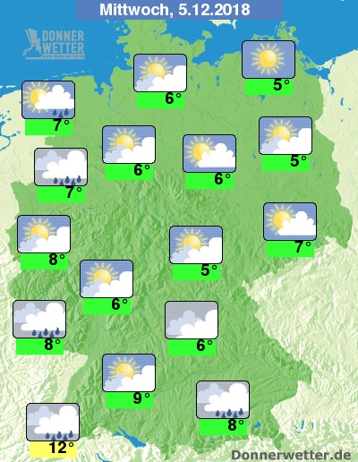 Die Tageshöchsttemperaturen liegen zwischen 5 Grad im Nordosten, sowie im Thüringer Becken und milden 12 Grad im Breisgau.
