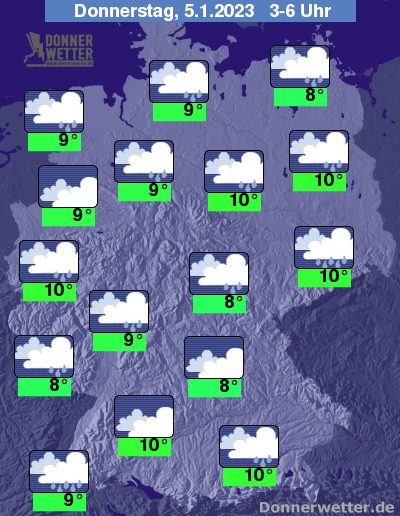 In der Nacht zum Donnerstag bleibt der Himmel stark bewölkt oder bedeckt, dazu bilden sich wiederholt Schauer. Die Temperatur sinkt auf 10 Grad in Berlin und 8 Grad in Saarbrücken. Der Wind weht noch oft stark bis stürmisch, an der Ostsee herrscht teilweise Sturm.