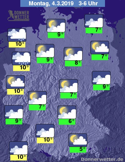 In der Nacht zum Montag ist es zunächst landesweit trocken, jedoch zum Großteil stark, hier und da auch etwas aufgelockert bewölkt. Im Laufe der Nacht zieht am Niederrhein und im Emsland Regen auf, der sich bis zum Morgen hin bis auf die Nordwesthälfte des Landes hin ausbreitet, sonst bleibt es noch trocken. Die Temperatur sinkt auf milde 10 Grad am Niederrhein und bis 5 Grad in Berchtesgaden.