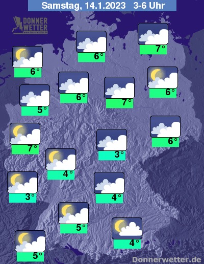 Am Samstag bleibt es weitgehend bedeckt. Der Regen breitet sich vom Niederrhein und der Ems ostwärts aus und erreicht gegen Abend auch die östlichen und südöstlichen Landesteile, zuvor bleibt es hier noch trocken. Die Temperatur steigt auf 7 Grad in Erfurt und bis 12 Grad in Köln. Von Westen her wird der Wind zunehmend stürmisch, an den Küsten und auf den Bergen herrscht Sturm.