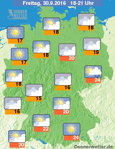 In der Nacht zum Samstag ziehen aus Südwesten dichte Wolken auf, die zuerst nur im Südwesten, bis zum Morgen hin auch im Westen bis in die Landesmitte hinein zum Teil kräftigen Regen bringen. An der Nordsee sind bei starker Bewölkung einzelne Schauer möglich, sonst ist es über dem Land verbreitet stark bis aufgelockert bewölkt und dazu trocken. Die Temperatur sinkt auf 14 Grad in Freiburg und etwa 8 Grad im Eichsfeld.