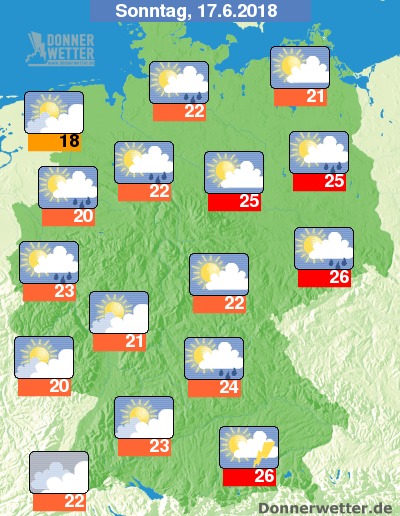 Am Sonntag bilden sich im Süden und Osten Deutschlands zeitweise Schauer und einzelne Gewitter, sonst ist es teils aufgelockert, teils stark bewölkt bei jedoch nur vereinzelten Schauern. Die Temperatur steigt auf 18 Grad im nördlichen Emsland und bis 26 Grad im Raum München.