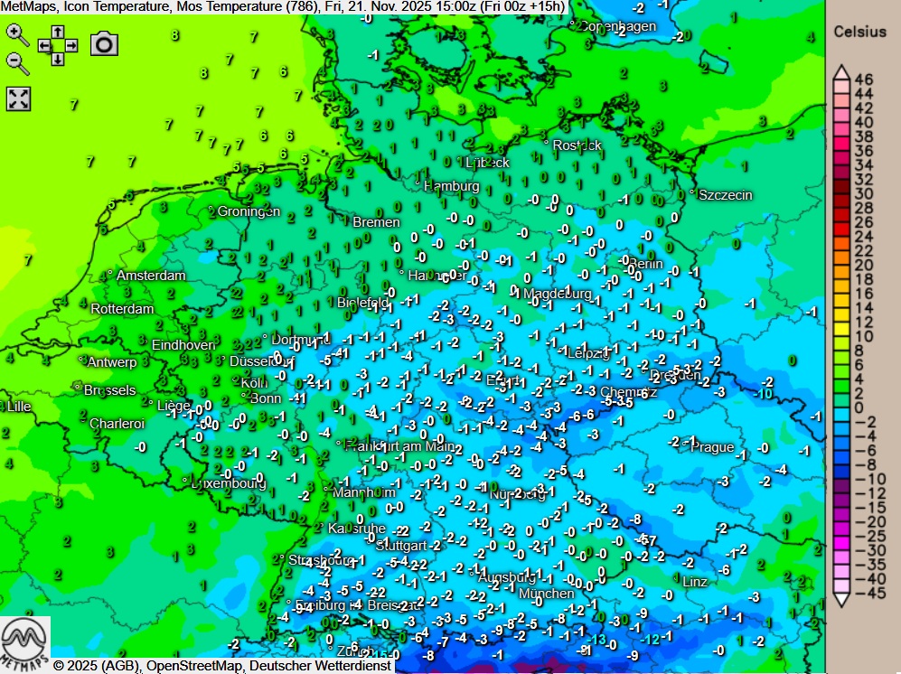 Die Temperatur- und Niederschlagstypkarte für Freitagnachmittag (15:00 Uhr) nach Icon: