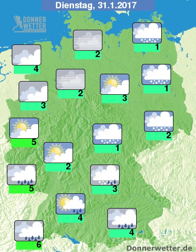 Am Dienstag fällt im Alpenvorland bei dichten Wolken zum Teil langanhaltender und ergiebiger Regen oder Schneeregen. Im übrigen Bundesgebiet ist es zumeist bedeckt oder trüb, dabei fällt im Osten und Nordosten gebietsweise Schnee, sonst bleibt es aber meist trocken. Die Temperatur erreicht 1 Grad in Vorpommern und etwa 6 Grad im Oberrheingraben.