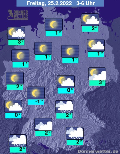 In der Nacht zum Freitag fällt im Süden noch vielerorts Schneeregen oder Schnee, sonst zeigt sich der Himmel verbreitet locker bewölkt oder sternenklar, wobei im Nordwesten wieder neue, oft dichte Wolken aufziehen, hier sind einzelne Schauer möglich, sonst bleibt es trocken. Die Temperatur sinkt auf 3 Grad in Dresden und -1 Grad in Wiesbaden.