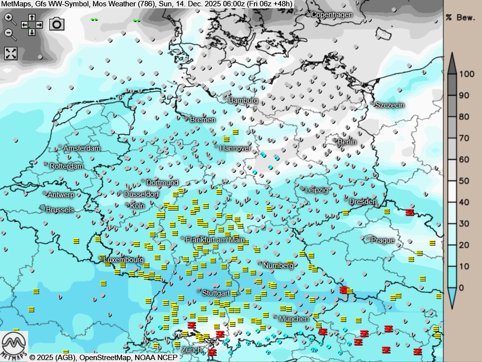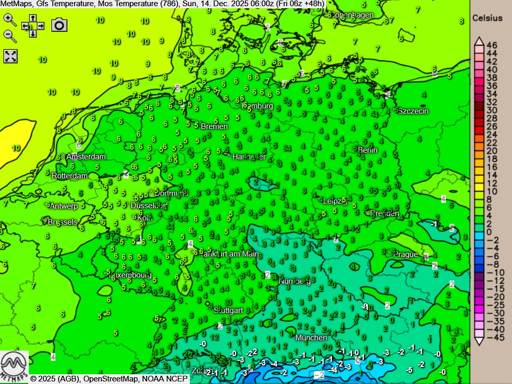 Die Temperatur- und Wetterkarte für Sonntagfrüh (06:00 Uhr) nach GFS: