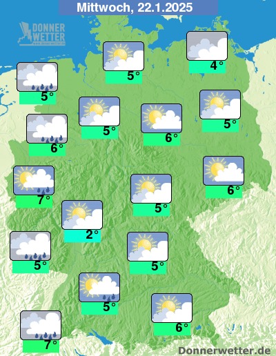 Am Mittwoch zeigt sich der Himmel im Osten nach Nebel- / Hochnebelauflösung heiter, in Höhenlagen ist es auch sonnig. Sonst ist es zunächst verbreitet wechselnd bewölkt. Im Westen nimmt die Bewölkung bereits im Vormittagsverlauf zu, dabei kann lokal auch etwas Regen oder Sprühregen fallen.
