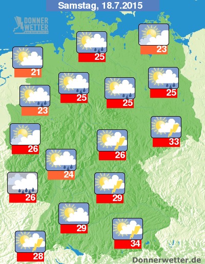 Am Samstag zeigen sich häufig heitere Abschnitte, jedoch ziehen auch zum Teil dichte Quellwolken auf und es sind dabei teils kräftige Schauer und regional schwere Gewitter möglich. Ab dem Nachmittag bleibt es im Norden und Westen bei meist heiterem Wetter jedoch trocken, sonst sind weiterhin einzelne Schauer und Gewitter möglich. Die Temperatur steigt auf 21 Grad an der Nordseeküste und bis auf schwülheiße 34 Grad in München.