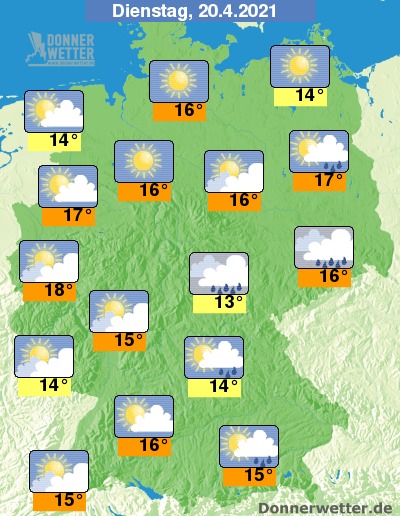 Heute zeigt sich das Wetter im Norden heiter bis sonnig und trocken, im übrigen Bundesgebiet ist es teils heiter, teils ziehen dichte Wolken durch, dabei sind örtliche Schauer und vereinzelt auch Gewitter möglich. Die Temperatur steigt auf 13 Grad im Eichsfeld und bis 18 Grad im Rheinland.