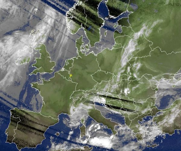 Auf dem Satellitenfoto von heute Morgen zeigen sich große Teile von Europa nur gering oder locker bewölkt. Tiefdruckgebiete über dem zentralen Mittelmeer und über der Ägäis bringen hier und mit ihren Ausläufern auch in einem weiten Umfeld sehr unbeständiges und oft von Schauern durchsetztes Wetter. Ein weiterer Tiefausläufer sorgt auch über Irland und dem Norden Schottlands für nasskaltes Wetter mit teils langanhaltendem Regen.