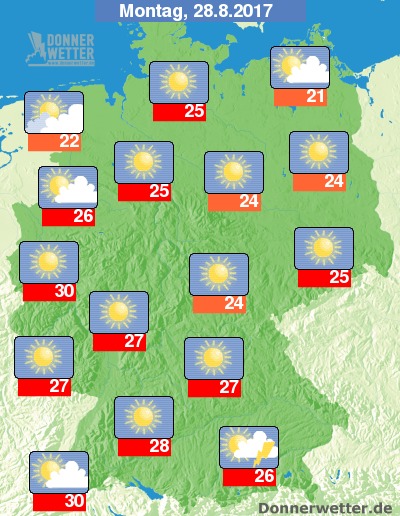 Zum Wochenstart erwartet uns fast im gesamten Bundesgebiet überwiegend sonniges und sonst nur leicht bewölktes und zudem trockenes Wetter. Einzig im Alpenvorland bilden sich im Tagesverlauf gebietsweise Schauer und auch teils kräftige Gewitter. Die Temperatur erreicht 21 Grad in Rostock und bis 30 Grad im Breisgau.