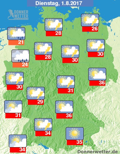 Am Dienstag zeigt sich die Nordwesthälfte Deutschlands meist stark, teils aber auch aufgelockert bewölkt, dazu bilden sich hier wiederholt Schauer und auch mögliche Gewitter. Im Süden und Osten bleibt es indes meist heiter und trocken, im Tagesverlauf sind jedoch auch hier einzelne Schauer oder Gerwitter möglich. Es werden 21 bis 36 Grad erreicht.