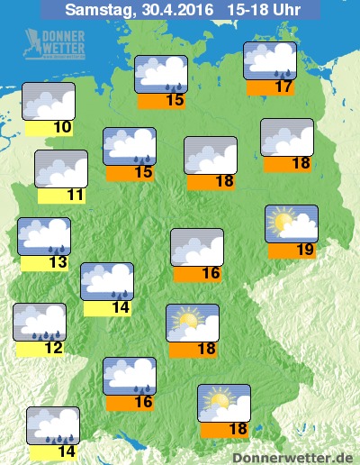 Heute Nachmittag ist es im Osten und Südosten noch gebietsweise aufgelockert bewölkt, oft aber auch schon stark bewölkt, hier bleibt es jedoch meist trocken. Über der Westhälfte und dem Norden ist die Wolkendecke hingegen weitgehend verschlossen und es bilden sich wiederholt Schauer, zudem sind auch einzelne Gewitter möglich. Die Temperatur steigt auf teils nur 10 Grad im nördlichen Emsland und bis 19 Grad in der Lausitz.
