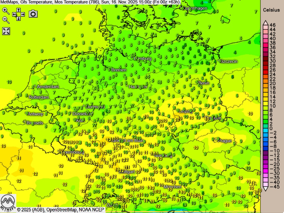 Die Wetter- und Temperaturkarte für Sonntagnachmittag (15:00 Uhr) nach GFS: