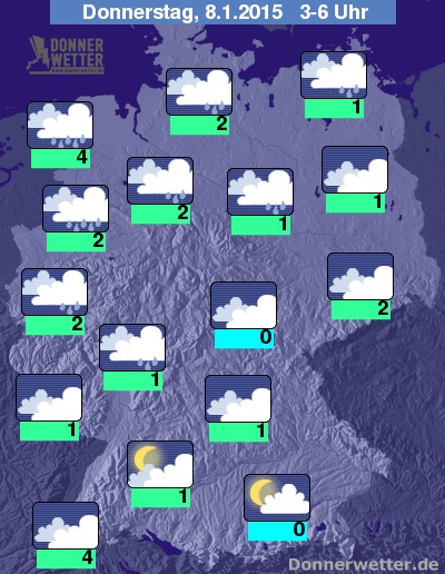Am Donnerstag halten sich die Wolken weitgehend dicht und die Sonne bekommt praktisch keine Chance sich zu zeigen, statt dessen fällt immer wieder, zum Teil kräftiger und teils auch ergiebiger Regen. Im Süden des Landes bleibt es bis zum Nachmittag noch weitgehend trocken, spätestens am Abend zieht aber auch hier Regen auf. Die Temperatur steigt auf 2 Grad im Vogtland und bis zu 8 Grad an der Nordseeküste. Besonders am Nachmittag weht ein teils starker Wind.