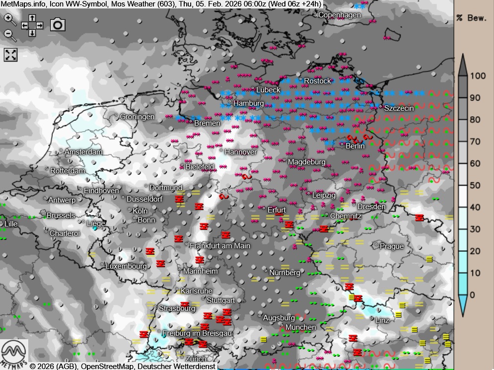 Am Donnerstag muss im Nordosten gebietsweise mit teils ergiebigen Schneefällen gerechnet werden; im Osten besteht Glättegefahr durch gefrierenden Regen. In den übrigen Landesteilen bleibt es heute bei einem Mix aus Sonne und Wolken weitgehend trocken.