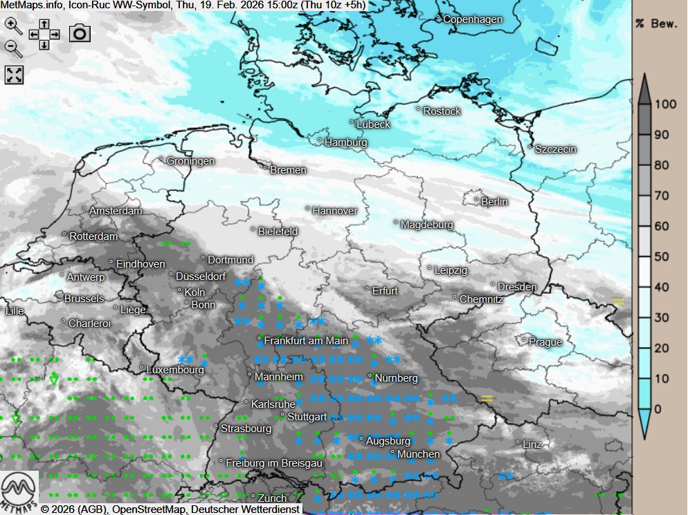 Am Donnerstagnachmittag bleibt es im Norden und Osten Deutschlands bei wechselnder Bewölkung weitgehend trocken. Von den Alpen breiten sich im Nachmittag teils kräftige Niederschläge aus, die bis in tiefe Lagen auch in Schnee übergehen können. Auch am Abend ist vor allem in Alpennähe noch kräftiger Schneefall möglich.
