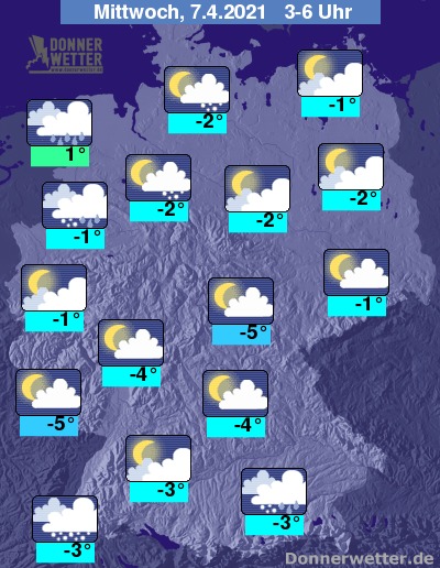 In der folgenden Nacht bleibt es im Alpenvorland sowie im Norden und Nordwesten des Landes meist stark bewölkt und hier fällt zeitweise Schnee, Schneeregen oder Regen, sonst ist es überwiegend locker oder aufgelockert bewölkt und es bleibt weitgehend trocken. An der Nordsee ist es zum Teil stürmisch. Die Temperatur sinkt auf 1 Grad im nördlichen Emsland und bis -5 Grad im Eichsfeld.