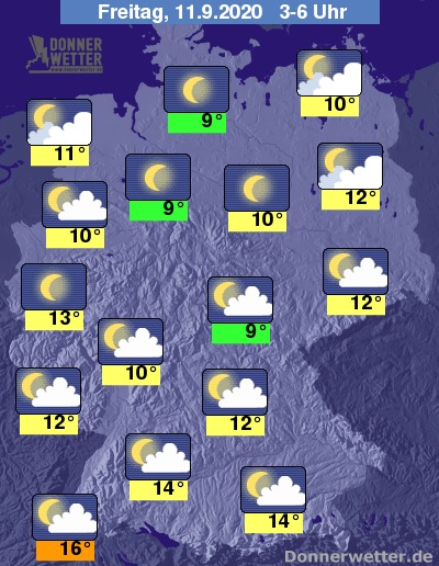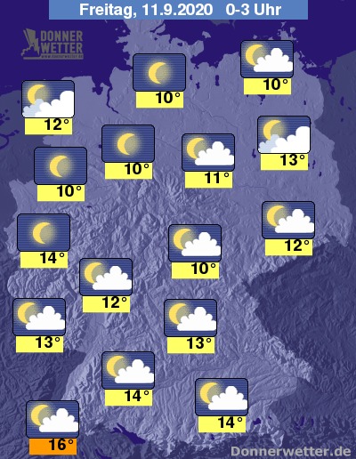Bis zu den Frühstunden kühlt die Luft auf 14 bis 7 Grad ab, am mildesten bleibt es mit Werten um 16 Grad an der Grenze zur Schweiz.