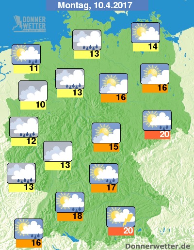 Heute zeigt sich über dem Süden und Osten Deutschlands anfangs noch verbreitet heiteres und trockenes Wetter. Im weiteren Verlauf ziehen allerdings auch hier, wie bereits schon zu Beginn des Tages in den anderen Landesteilen, dichte Wolken durch, die für zeitweiligen Regen und am Nachmittag besonders im Süden und Osten auch für teils kräftige Schauer, örtlich sogar Gewitter sorgen können. Die Temperatur erreicht nur noch etwa 10 Grad am Niederrhein und bis 20 Grad in Dresden und München.