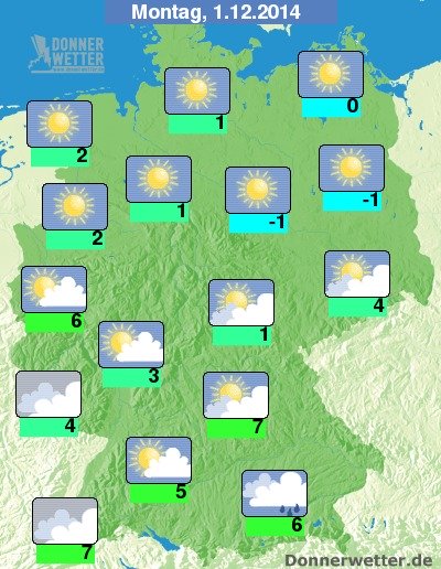Am Montag kann sich im Norden Deutschlands verbreitet die Sonne durchsetzen, dagegen halten sich im Süden weitgehend dichte Wolken aus denen gelegentlich auch Regen fallen kann. Auch in der Mitte des Landes bleibt es oft neblig trüb und die hochnebelartige Bewölkung kann nur gebietsweise auflockern. Dazu bleibt es trocken. Die Temperatur erreicht -1 Grad in Neubrandenburg und bis 7 Grad in Niederbayern.