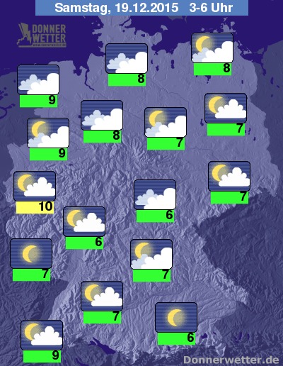 In der folgenden Nacht ist es vor allem nach Süden und Südwesten hin oft nur locker bewölkt oder auch sternenklar. Im übrigen Bundesgebiet wechselt sich meist starke und aufgelockerte Bewölkung ab, dazu bleibt es trocken. Die Temperatur sinkt auf milde 10 Grad in Düsseldorf und bis 6 Grad in München.