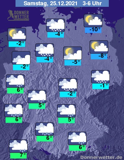 Am Samstag zeigt sich das Wetter im Norden oft heiter bis sonnig, dabei bleibt es trocken. Über der Südhälfte bleibt es hingegen bedeckt und es fällt zeitweise Regen, über der breiten Landesmitte fällt überwiegend Schneeregen oder Schnee. Die Temperatur steigt auf -4 Grad in Vorpommern und bis zu 10 Grad am Oberrhein.