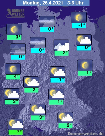 In der Nacht zum Montag ist es an den Alpen und gebietsweise im Osten stark bewölkt, ansonsten ist der Himmel über dem Land aber verbreitet sternenklar oder locker bewölkt. Es bleibt trocken bei Tiefstwerten von 7 Grad in Freiburg und um -1 Grad in Neubrandenburg.