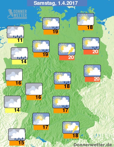 Am Samstag zeigt sich das Wetter in den westlichen Landesteilen meist stark bewölkt, aber auch sonst ziehen zunehmend mehr und auch teils dichte Wolken durch, dabei muss mit einzelnen Schauern gerechnet werden. Örtlich sind sogar Gewitter möglich. Über der Osthälfte und besonders nach Osten hin scheint jedoch auch noch häufig die Sonne. Die Temperatur steigt auf nur noch 11 Grad in Emden und bis etwa 20 Grad in Magdeburg.