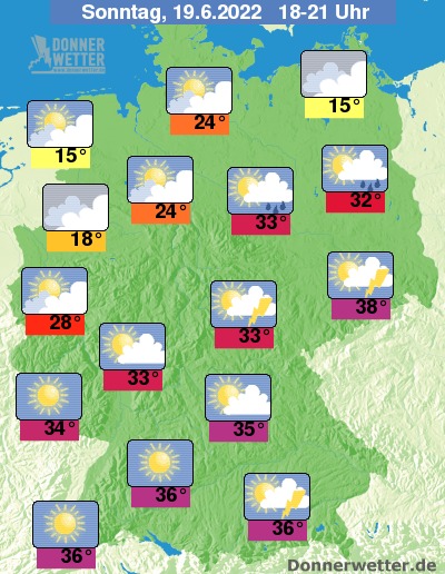 Heute Abend ist es vor allem im Süden, Südwesten und teils auch im Westen überwiegend heiter bis sonnig und trocken. In den übrigen Landesteilen ziehen dagegen oft viele und zum Teil dichte Quellwolken durch, dabei können sich örtliche Schauer und Gewitter bilden. Die Temperatur liegt bei 15 Grad an den Küsten und bei ungewöhnlich heißen 38 Grad in der Lausitz.