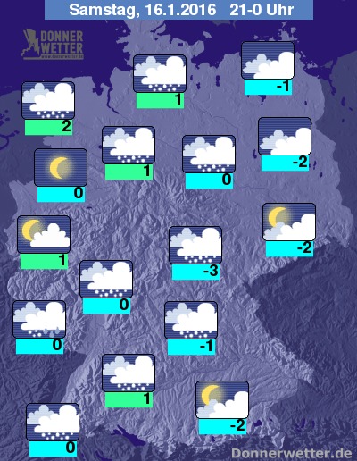 Heute Abend erstreckt sich das Schneefallgebiet vom Norden, über die Landesmitte bis in den Süden der Republik, es fällt zum Teil langanhaltender und örtlich auch ergiebiger Schnee, dazu besteht erhöhte Glättegefahr! Weiter nach Westen hin zeigt sich der Himmel hingegen meist locker bewölkt oder sternenklar, dazu bleibt es trocken. Im Osten ist es zwar meist stark bewölkt, aber weitgehend trocken. Die Abendtemperatur liegt bei 2 Grad an der Nordsee und bis -3 Grad im Vogtland.