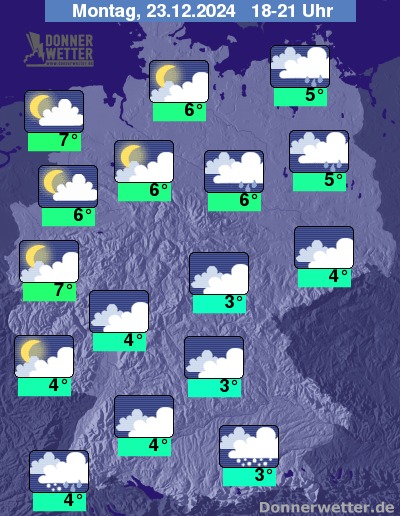 Am Heiligabend ist es über dem Land verbreitet stark, vor allem im Norden und Westen zumindest teilweise auch mal aufgelockert bewölkt. Im Süden und über Sachsen fällt anfangs noch etwas Schnee oder Schneeregen, sonst bleibt es jedoch meist trocken. Die Temperatur erreicht teils 0 Grad an den Alpen und bis etwa 6 Grad im Rheinland.