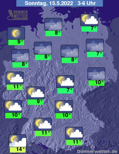 In der folgenden Nacht zeigt sich der Himmel über dem Land verbreitet locker bewölkt oder sternenklar, im Südwesten halten sich teils auch einige Wolken, dazu bleibt es trocken. Die Temperatur sinkt auf 14 Grad im Breisgau und bis 7 Grad an der Müritz.