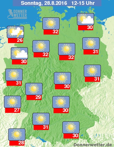 Heute Nachmittag scheint über der Bundesrepublik verbreitet die Sonne und es ziehen nur selten wenige Wolken durch, dabei bleibt es trocken. Über Schleswig-Holstein und im Umfeld von Nord- und Ostsee sind jedoch vielerorts einige und zum Teil auch dichte Wolken möglich, dazu bilden sich hier und da auch Schauer oder lokale Gewitter. Die Temperatur steigt auf 26 Grad in Cuxhaven und bis etwa 32 Grad in Hannover.