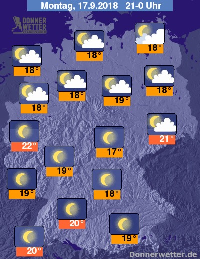 Am späten Abend und in der Nacht bleibt der Himmel über der Nord- und anfangs auch über der Osthälfte locker bewölkt. Im Osten klart  es im Nachtverlauf teilweise auf. Im restlichen Bundesgebiet bleibt der Himmel zumeist wolkenfrei.
