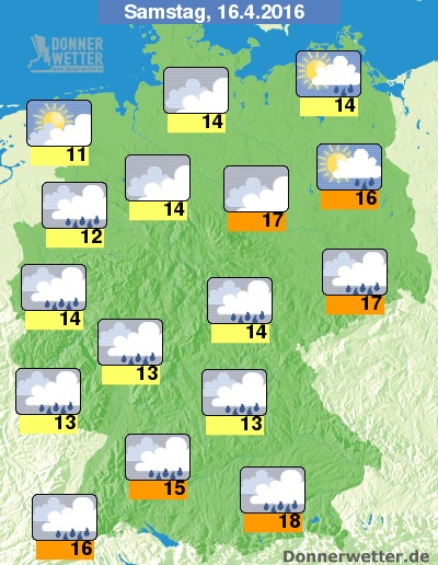 Heute halten sich im Land überwiegend dichte Wolken, im Norden und über der breiten Mitte sind jedoch gelegentliche Auflockerungen möglich. Über der Südhälfte Deutschlands fällt zeitweise Regen, im Südwesten entwickeln sich lokal auch Gewitter, im übrigen Bundesgebiet bilden sich einzelne Schauer, oft bleibt es aber auch trocken. Die Temperatur steigt auf 11 Grad an der Nordseeküste und auf 18 Grad in Rosenheim.